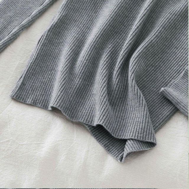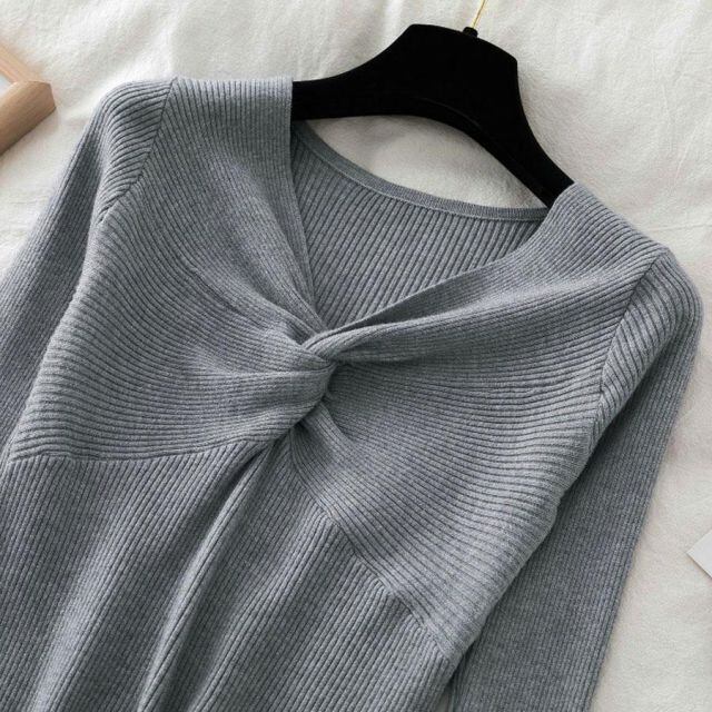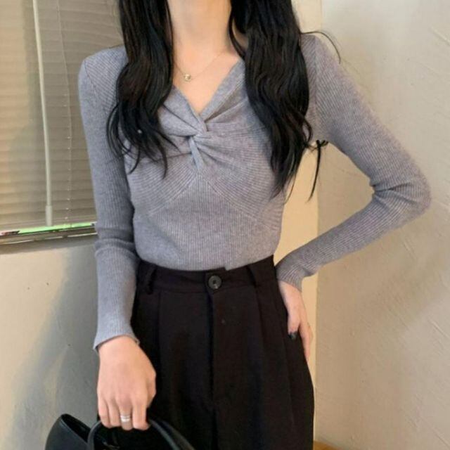 商品名:リブニット ツイスト トップス レディース ひねり ニットソー Vネック ストレッチ プルオーバー 長袖 ニットセーター 着やせ 長袖(メール便送料無料)