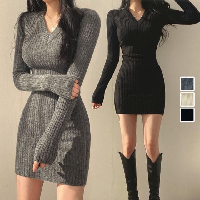 商品名:タイトワンピース Vネック リブ レディース 長袖 ストレッチ 黒 着痩せ 秋冬 セーター 胸元 セクシー デート インナーワンピース(メール便送料無料)