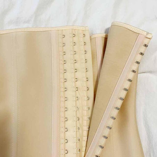 2、お腹を少しへこませた状態でホックを上側から留めていきます。