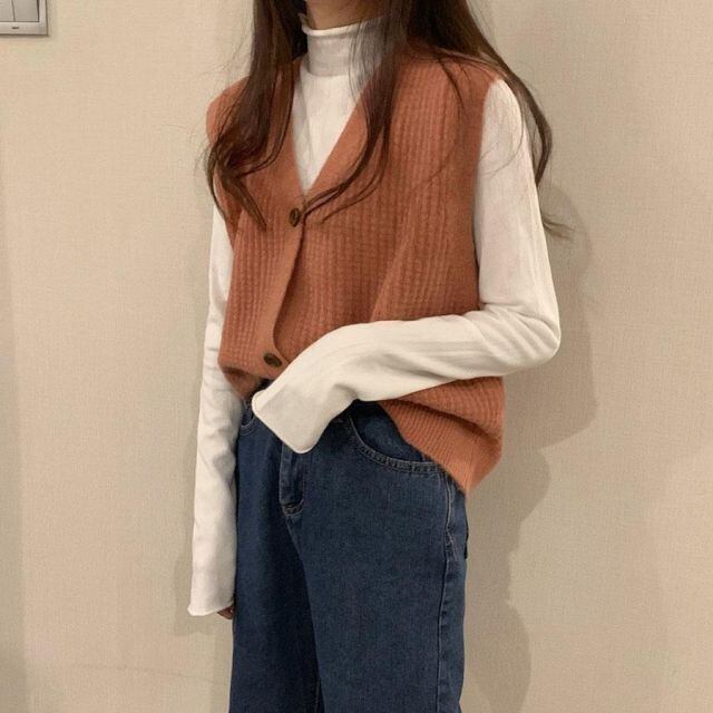商品名:ニットベスト トップス 韓国ファッション きれいめ ノースリーブ Vネック 通勤 通学 お洒落 カジュアル ボタン付き 前開け(メール便送料無料)