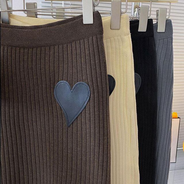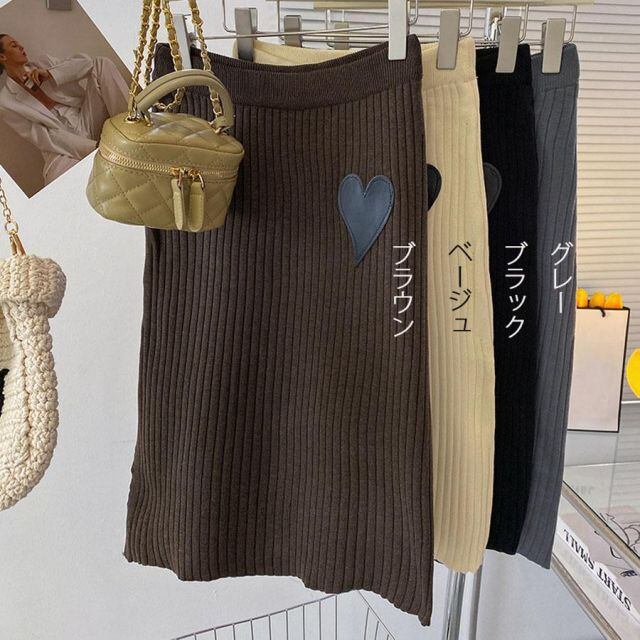 商品名:リブニットスカート ハート スリット入り スカート レディース ニットスカート 秋冬 ミディアム ウエストゴム 膝丈 ストレッチ(メール便送料無料)
