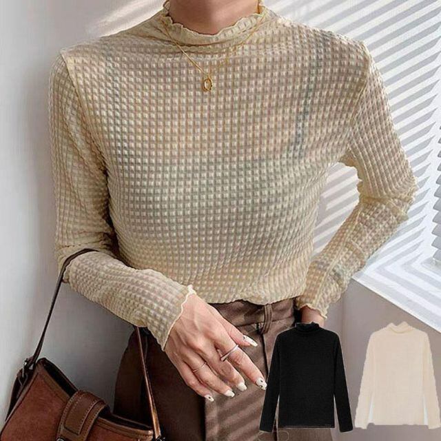商品名:シアートップス チュールトップス レディース 長袖 ハイネック インナーTシャツ 透け感 レイヤード 薄手 カットソー シースルーレース(メール便送料無料)