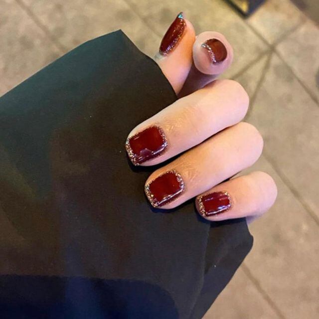 ネイルチップを爪の根本に合わせ、先端に向けて傾けるように貼れば完成です。