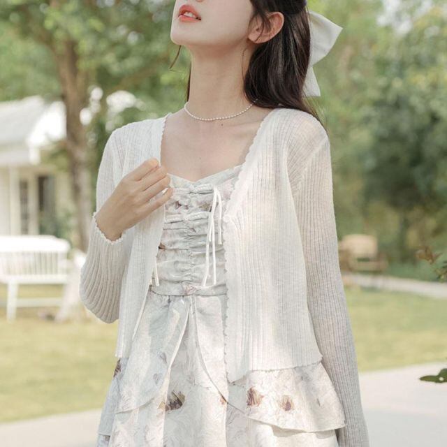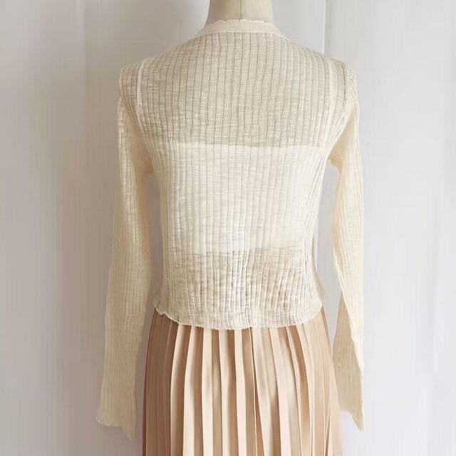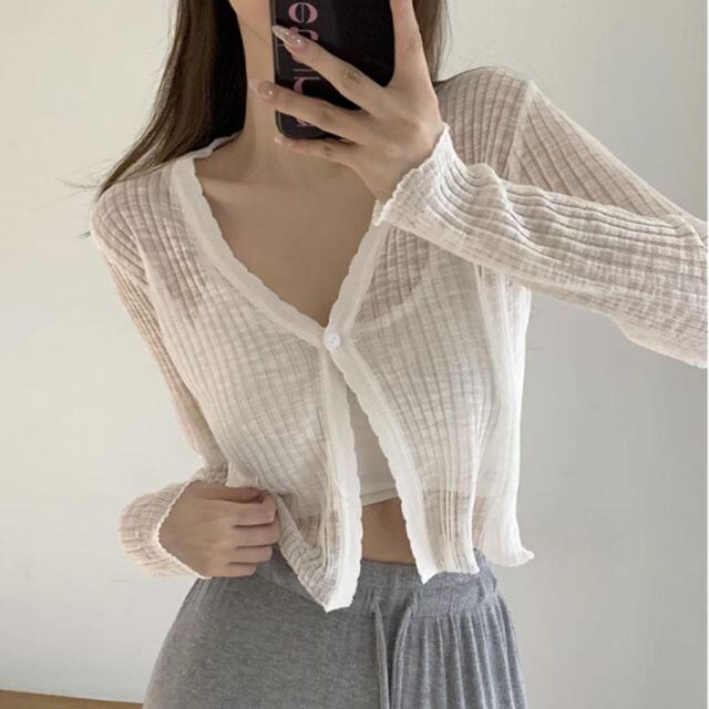 商品名:サマーカーディガン 透かし編み Vネックカーディガン トップス 長袖 ショート丈 前開き 透け感 重ね着 かわいい フェミニン(メール便送料無料)