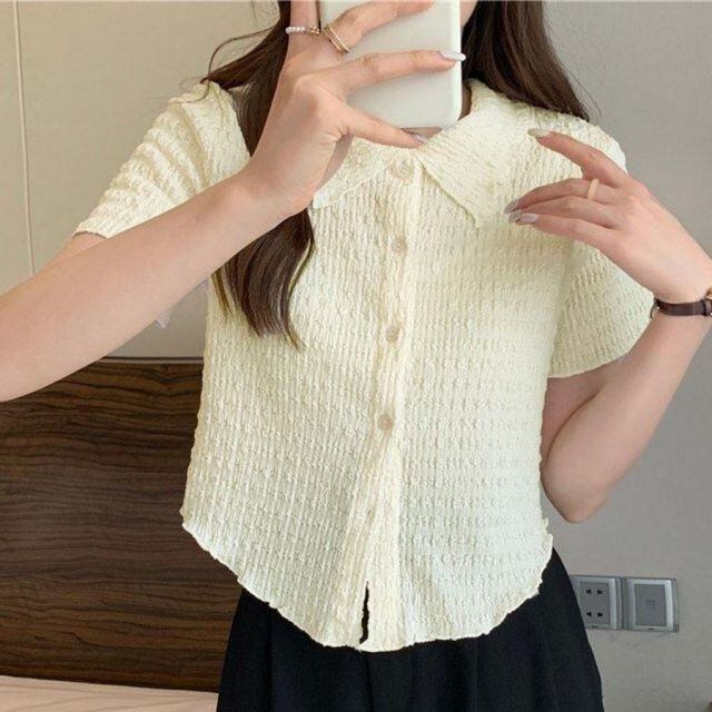 襟付き半袖 Tシャツ tブラウス ポロシャツ クロップド丈 レディース 半袖 トップス 春夏 トップス デイリー 襟付きリブ 半袖 リブ(メール便送料無料)
