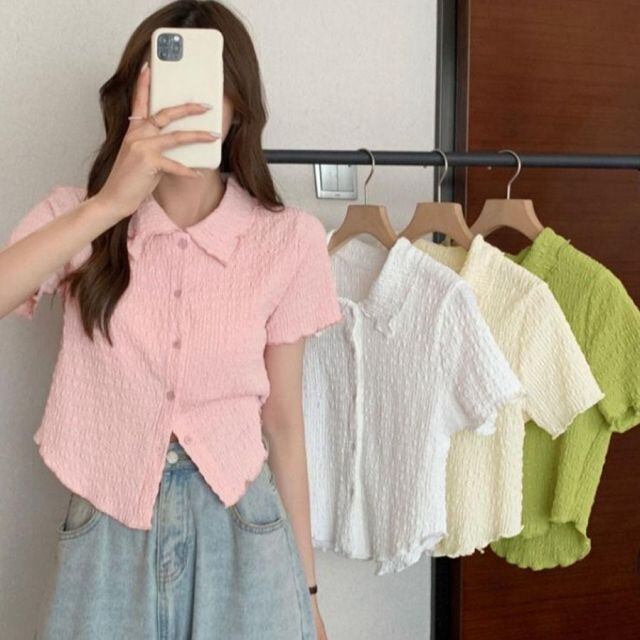 商品名:襟付き半袖 Tシャツ tブラウス ポロシャツ クロップド丈 レディース 半袖 トップス 春夏 トップス デイリー 襟付きリブ 半袖 リブ(メール便送料無料)
