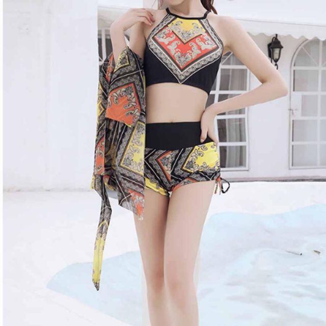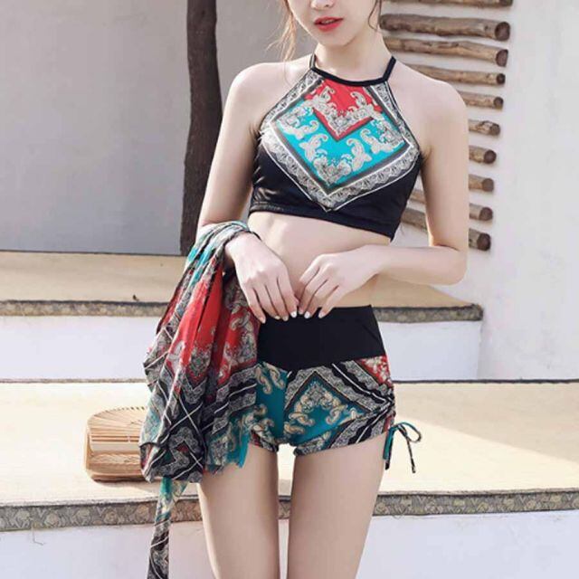 ブラ×ショーツ×パレオエスニック柄水着3点セット。
