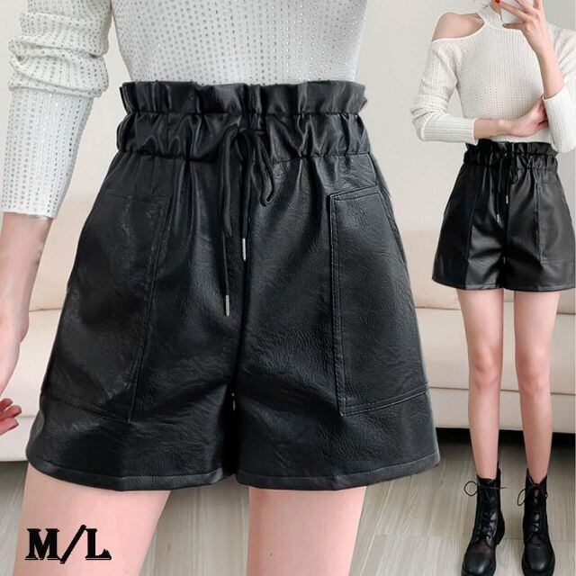 商品名:ボードショートパンツ レディース フェイクレザーショートパンツ レザーパンツ 短パン ショーパン 革 ボトムス 黒(メール便送料無料)