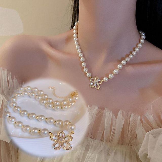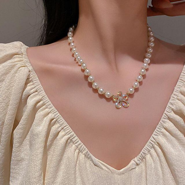 商品名:パールネックレス 花 ラインストーン 上品 エレガント フェミニン シンプル フェイクパール ボリューム ネックレス フラワーネックレス(メール便送料無料)