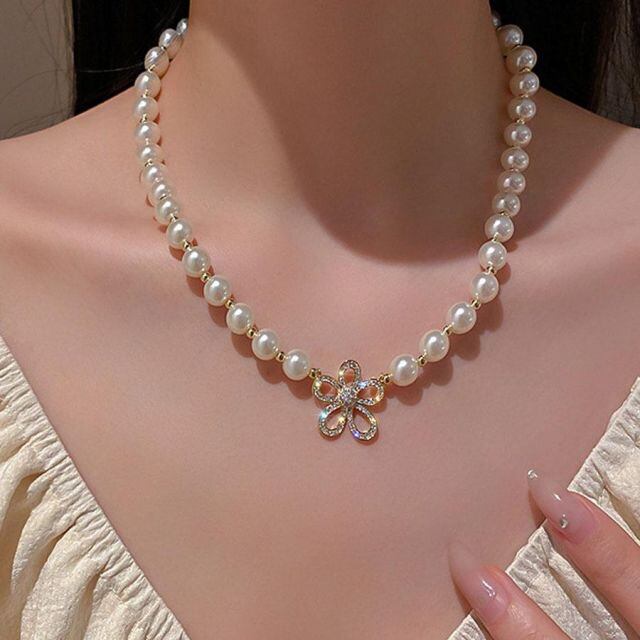 パールネックレス 花 ラインストーン 上品 エレガント フェミニン シンプル フェイクパール ボリューム ネックレス フラワーネックレス(メール便送料無料)