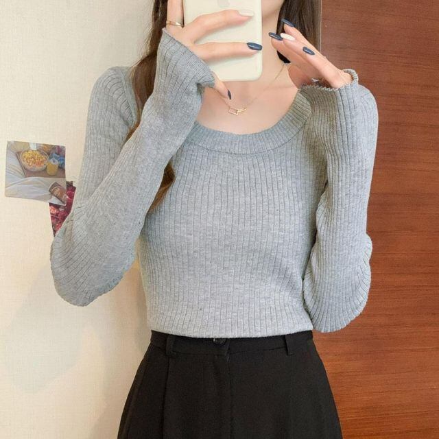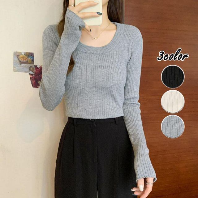 商品名:リブニット ラウンドネック 薄手 細身 レディース トップス ニットスリム デイリー 通勤・オフィス(メール便送料無料)