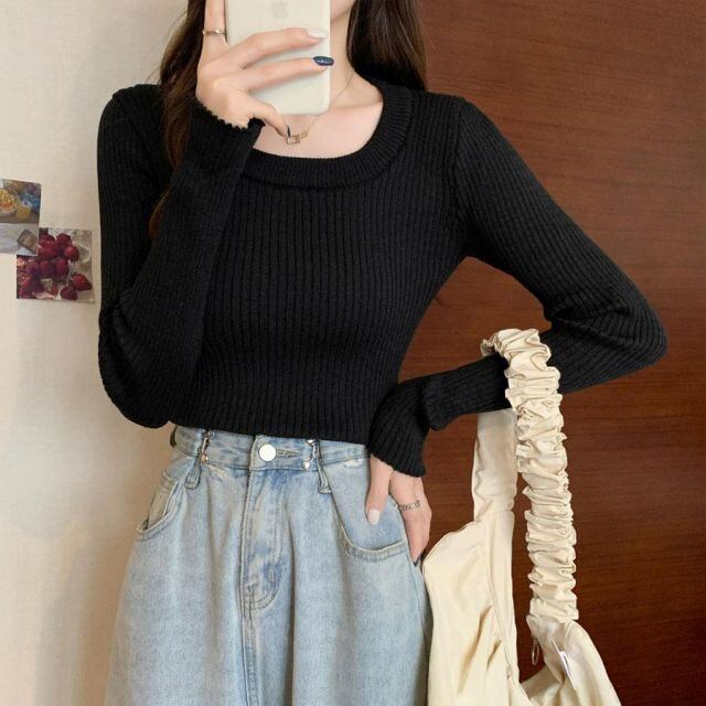 使い勝手の良いシンプルなショート丈ニットトップス。