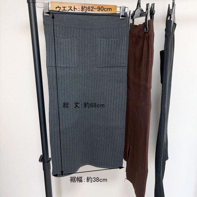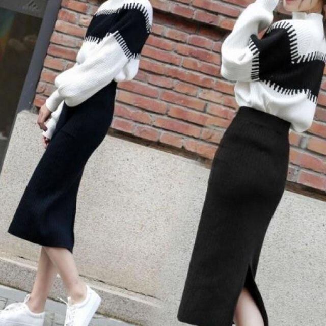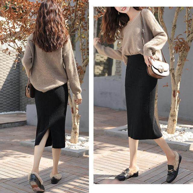 商品名:リブスリット入りニットスカート スカート レディース ニットスカート 秋冬 スリット ミディアム ひざ丈 ウエストゴム 膝丈 ストレッチ(メール便送料無料)