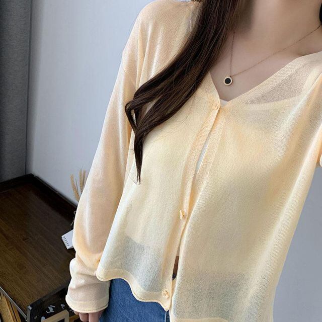 商品名:サマーニット カーディガン レディース カーディガン トップス 長袖 無地 日焼け防止 前開き 薄手 UV対策 体型カバー 冷房対策(メール便送料無料)