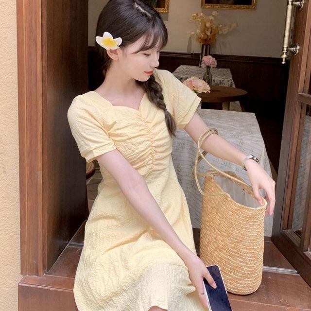 商品名:夏服 Vネックワンピース 半袖 韓国 ウエスト紐あり 膝下ワンピース Aラインワンピース 半袖 韓国ファッション おしゃれ 清楚 お出かけ(メール便送料無料)