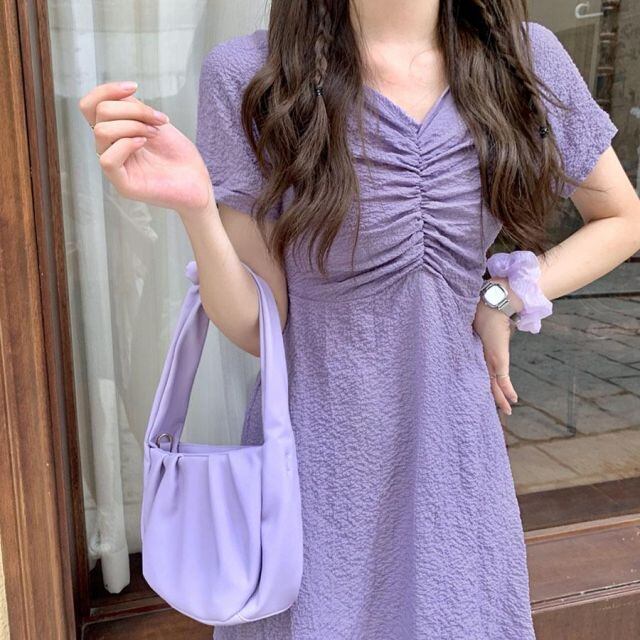 フロントのギャザーが魅力的なボディラインを演出する可愛いワンピース。