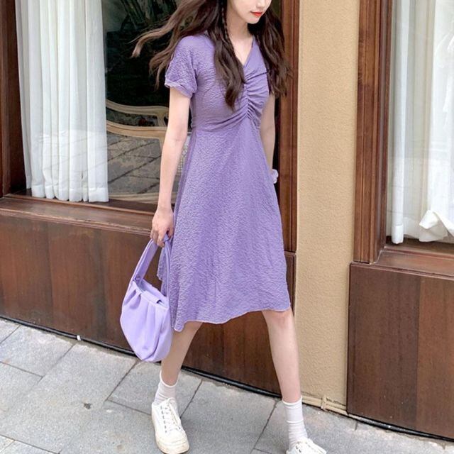 夏服 Vネックワンピース 半袖 韓国 ウエスト紐あり 膝下ワンピース Aラインワンピース 半袖 韓国ファッション おしゃれ 清楚 お出かけ(メール便送料無料)