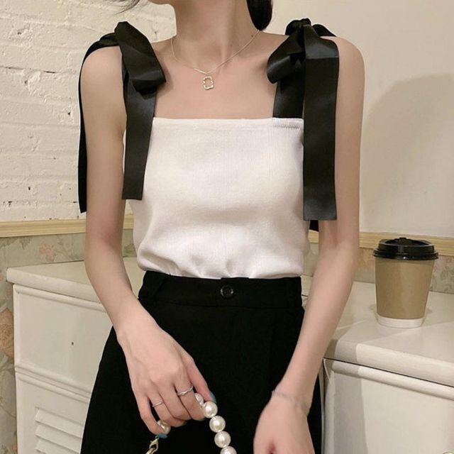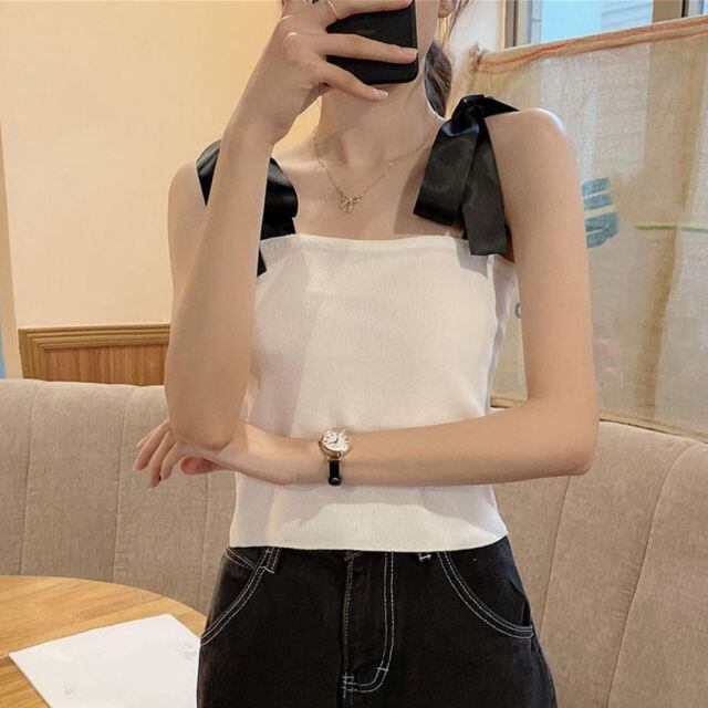 商品名:ニットキャミソール 肩紐 リボン ニットトップス サマーニット タンクトップ Vネック ノースリーブ 無地 薄手 トップス 重ね着(メール便送料無料)