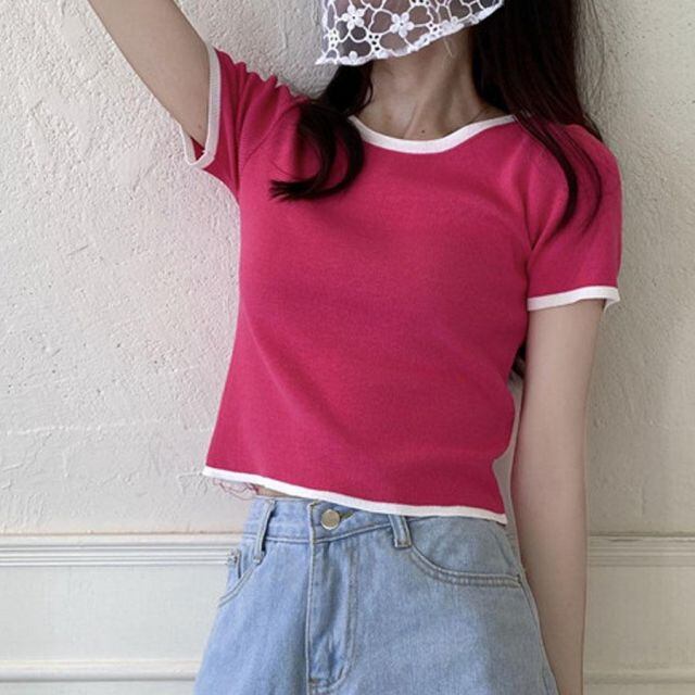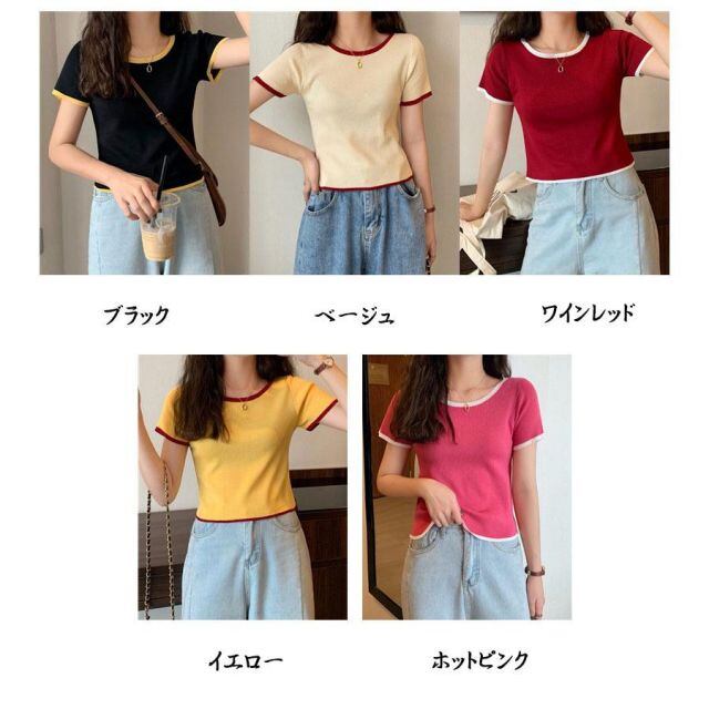 商品名:夏服Tシャツ トップス レディース 半袖 クルーネック 配色 ショート丈 無地 シンプル カットソーカジュアル(メール便送料無料)