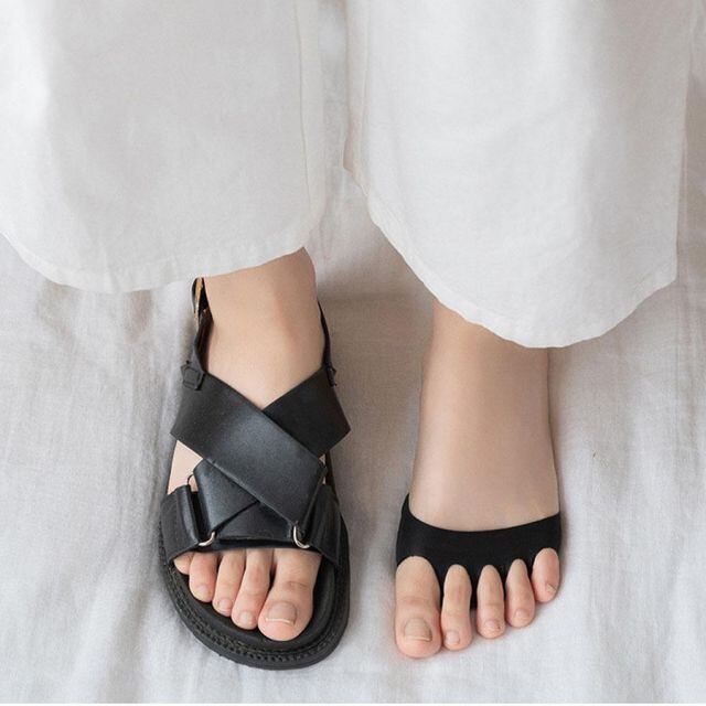 パンプスやハイヒール、つま先やかかと部分が露出したサンダルやミュールにも合わせて使える。