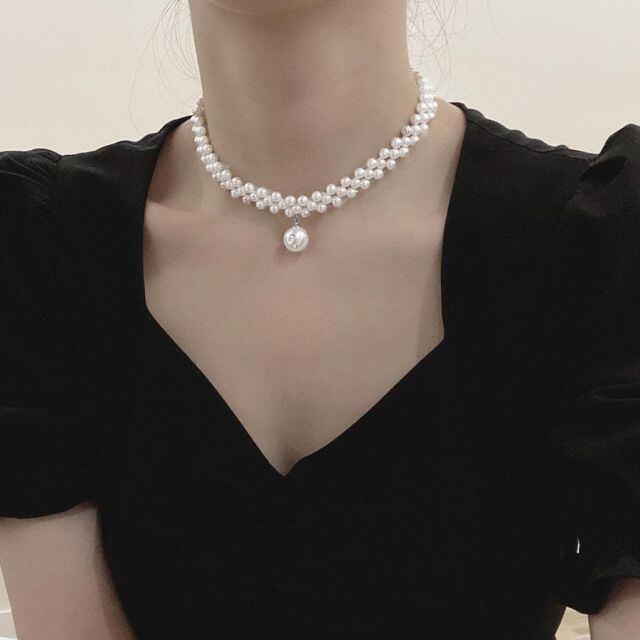 人気のフェイクパールを連ねた可愛いデザインのネックレス。