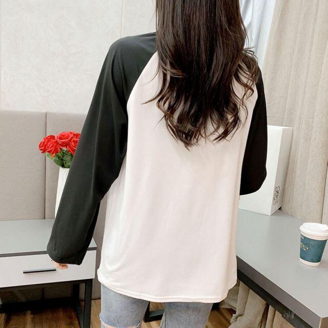 商品名:Tシャツ レディース 長袖 バイカラーtシャツ トップス ラウンドネック無地 綿 カットソー 薄手 黒 白 カジュアル(メール便送料無料)