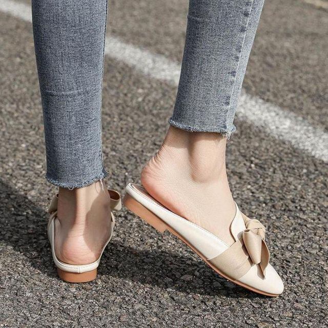 ミュールサンダル リボン ミュールパンプス ポインテッドトゥ スリッポンサンダル 美脚 フラットタイプ シューズ ミュール スリッパシューズ(宅急便のみ対応)