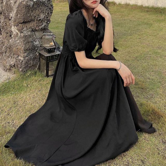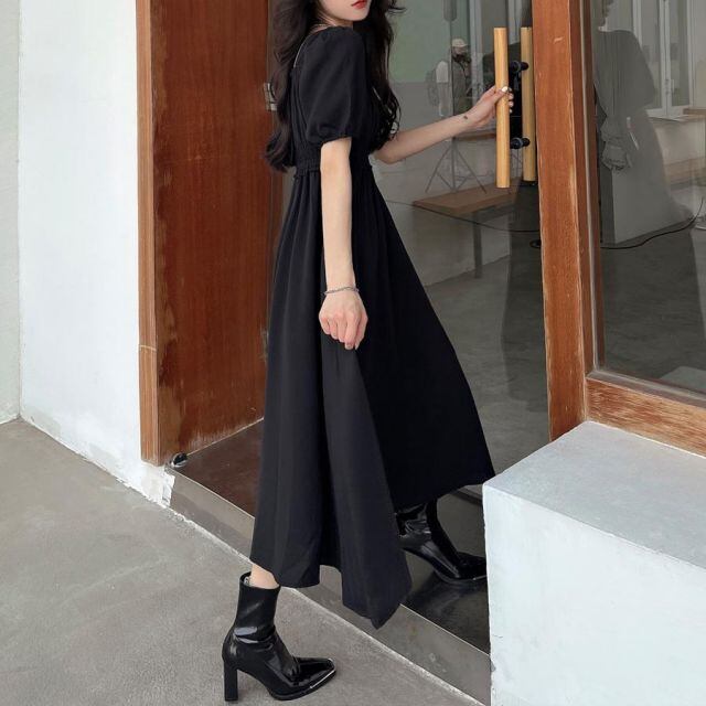 商品名:ワンピース 半袖 ボートネック ロングフレアワンピース レディース ひざ下 大人 きれいめ 無地 おしゃれ オフィス フォーマル 黒(メール便送料無料)