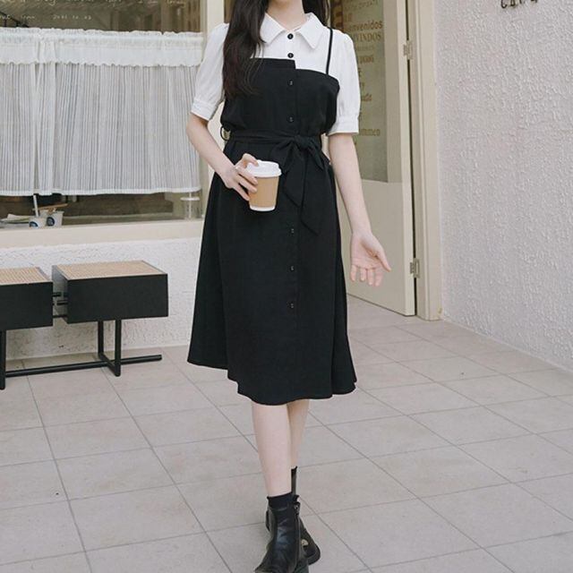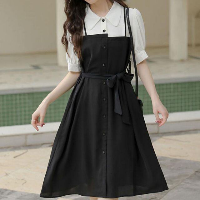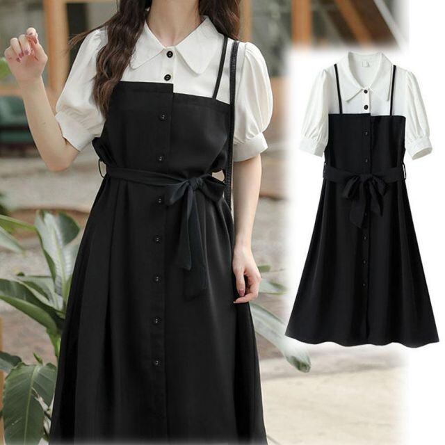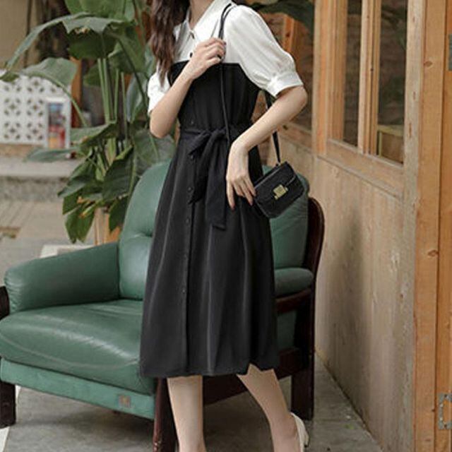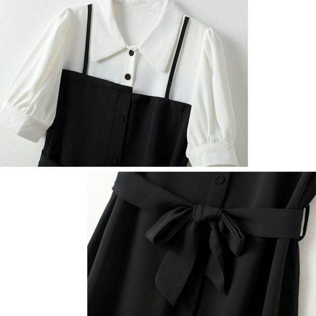 襟付きシャツトップスと切り替えの重ね着風デザインワンピース。