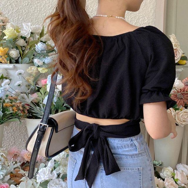商品名:ブラウス風 バックリボン スクエアネック へそ出し 無地 ショート丈 きれいめ 半袖 鎖骨見せ オシャレブラウス 韓国風 大人可愛い(メール便送料無料)