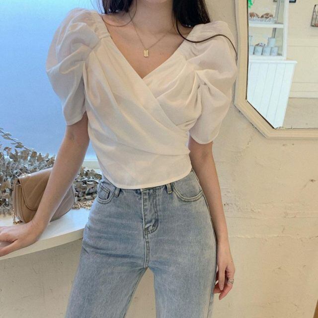 商品名:2022新作カシュクールブラウス リボン Vネック へそ出し 無地 ブラウス シャツ トップス きれいめ 半袖 鎖骨見せ 韓国風 大人可愛い(メール便送料無料)