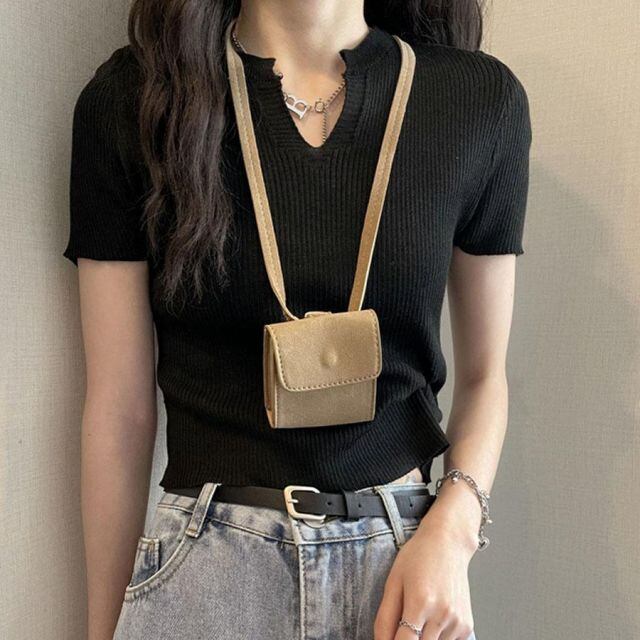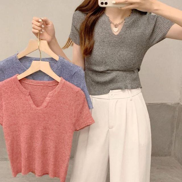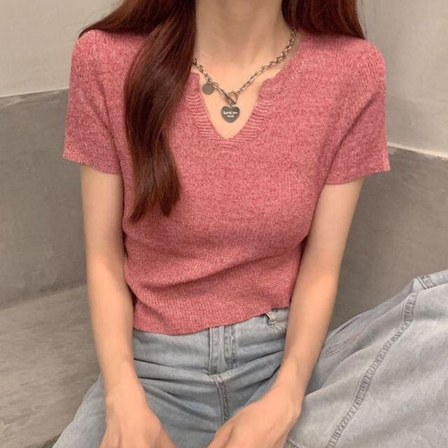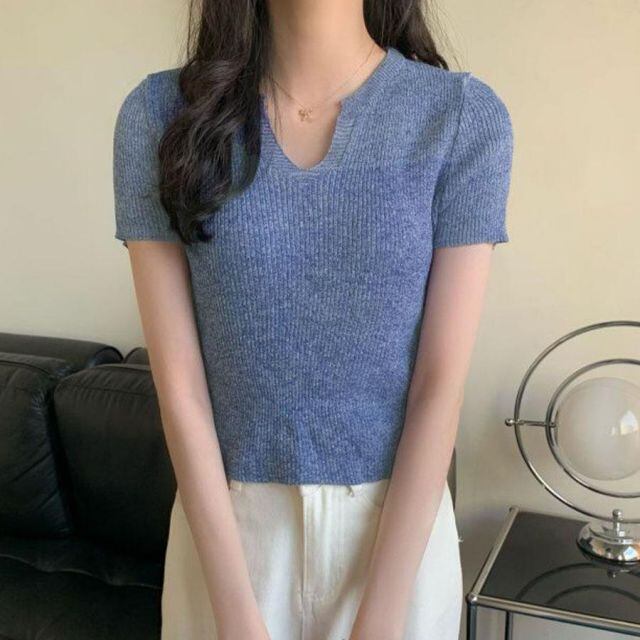 商品名:サマーニット へそ出し トップス Vネック クロップド丈 Tシャツ レディース きれいめ ショート丈トップス ニットソー(メール便送料無料)