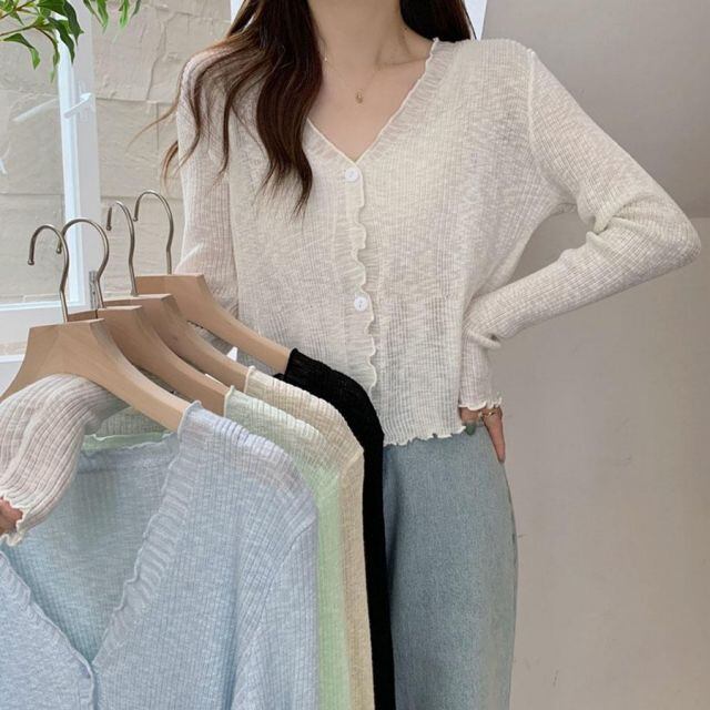 サマーカーディガン 透かし編み Vネックカーディガン トップス 長袖 ショート丈 前開き 透け感 重ね着 かわいい フェミニン 大人(メール便送料無料)