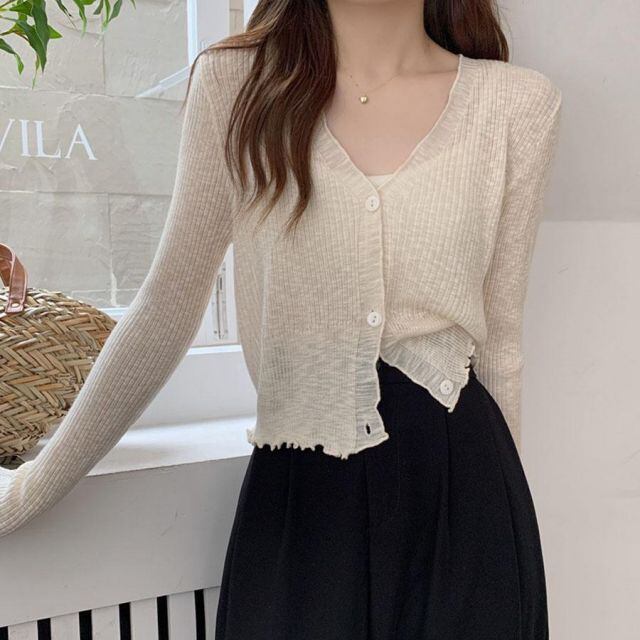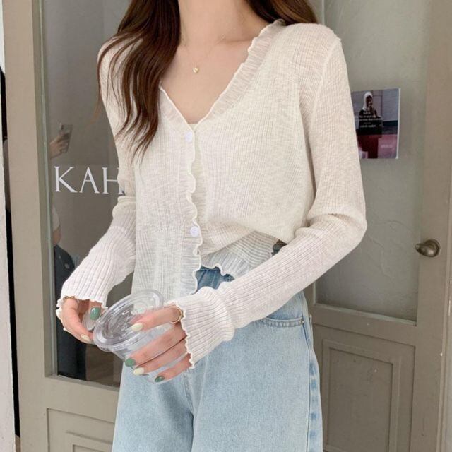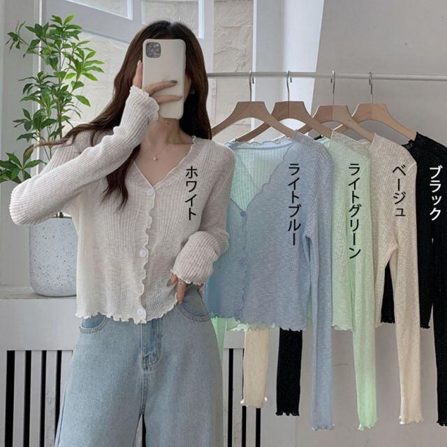 商品名:サマーカーディガン 透かし編み Vネックカーディガン トップス 長袖 ショート丈 前開き 透け感 重ね着 かわいい フェミニン 大人(メール便送料無料)