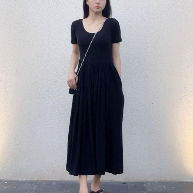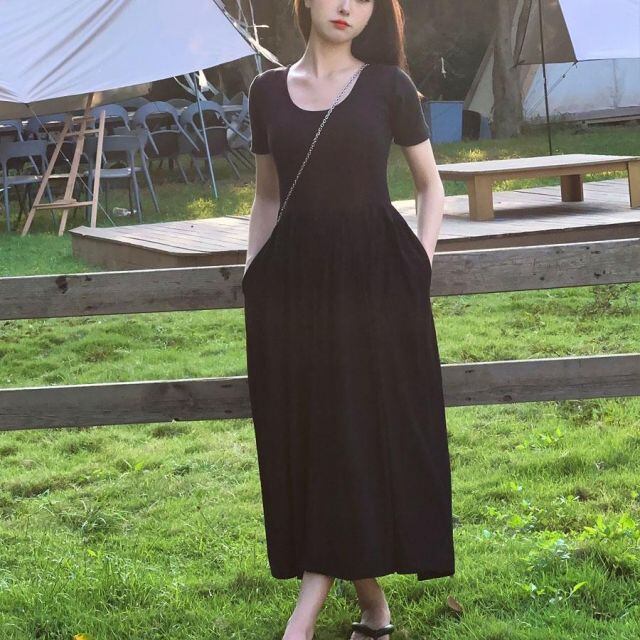 商品名:切り替えワンピース 半袖 ロングワンピース 接触冷感 ひんやり フレア 半袖 ラウンドネック ロング丈 無地 ロングフレアワンピース(メール便送料無料)