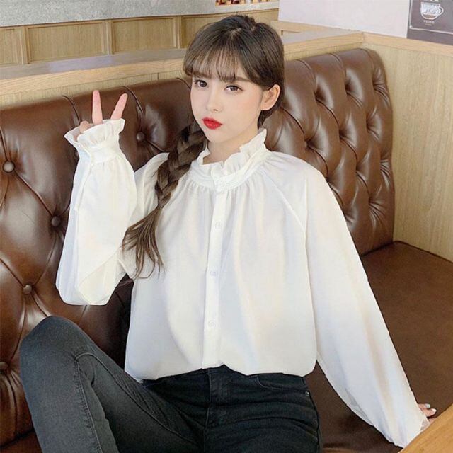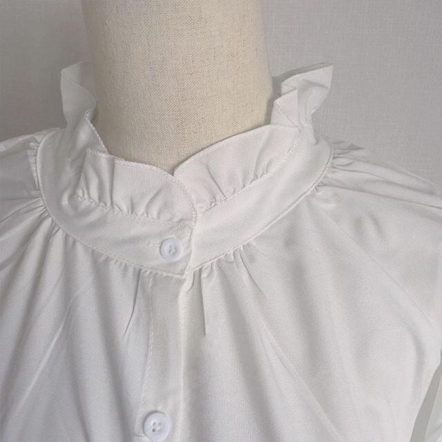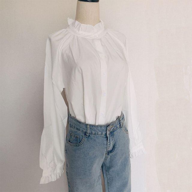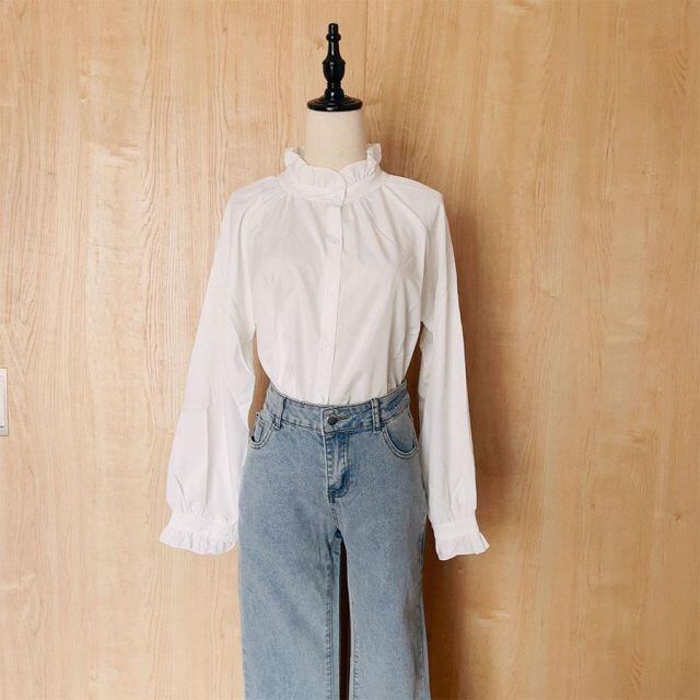 商品名:ブラウス シャツ フリル 大きめ レディース 長袖 白ブラウス フレアネック フリル トップス オフィス 着痩せトップス韓国ファッション(メール便送料無料)