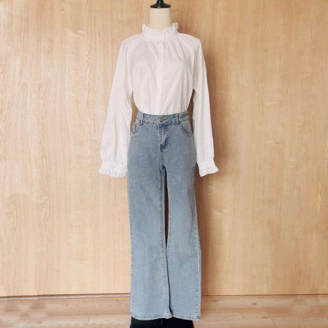 ブラウス シャツ フリル 大きめ レディース 長袖 白ブラウス フレアネック フリル トップス オフィス 着痩せトップス韓国ファッション(メール便送料無料)
