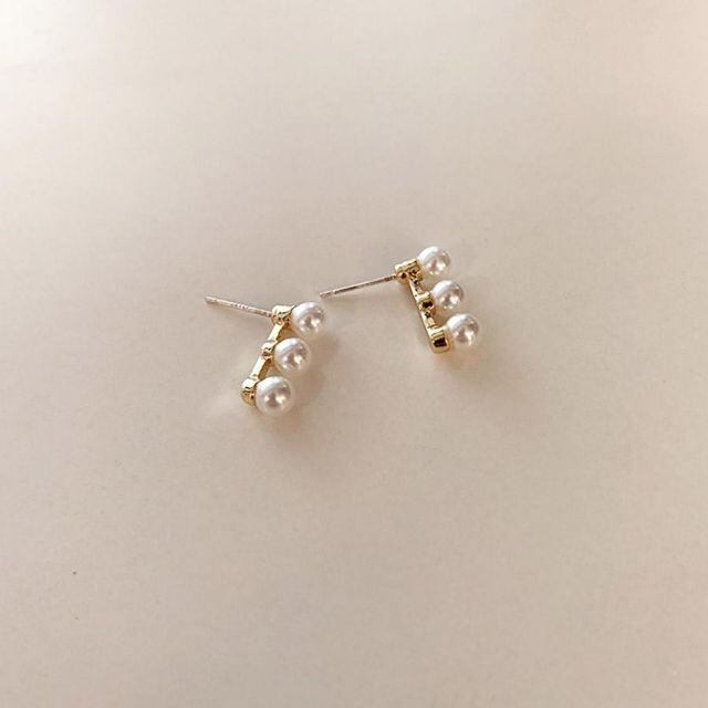 3連なったパールが可愛い、揺れるロングピアス。