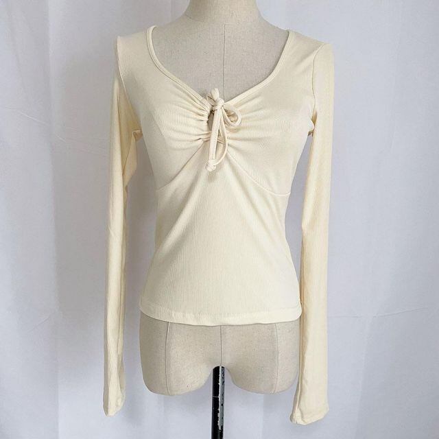 大きく開いた首元と紐が大人かわいい雰囲気を演出してくれます。