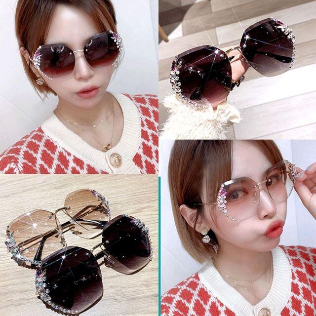 サングラス フレームレス 紫外線カット ラインストーン 眼鏡 メガネ 小顔効果 大きめ 軽量 韓国風トレンド(宅急便のみ対応)