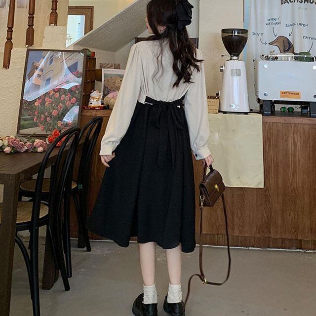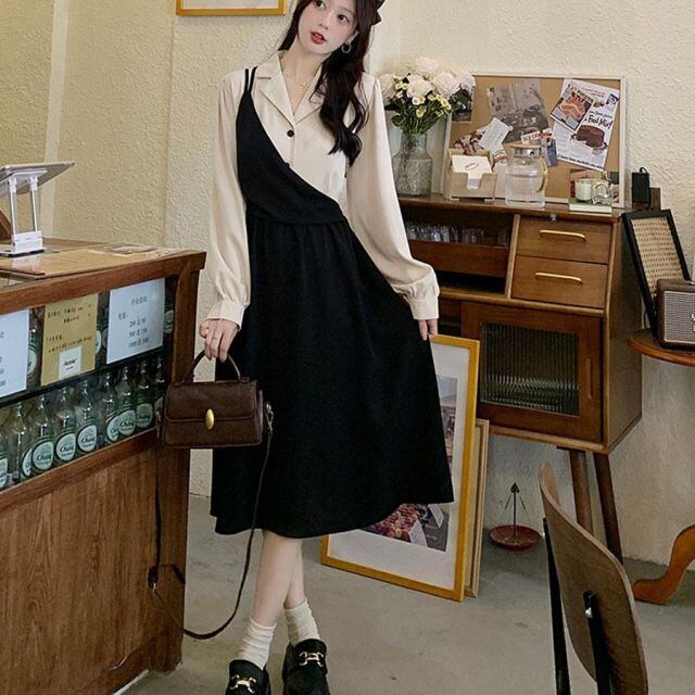ワンピース Vネック ロングフレアワンピース 切り替え レイヤード風 ひざ下 大人 きれいめ 無地 おしゃれ オフィス フォーマル 黒(メール便送料無料)