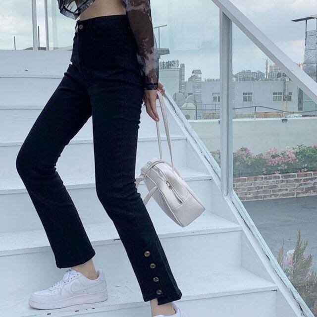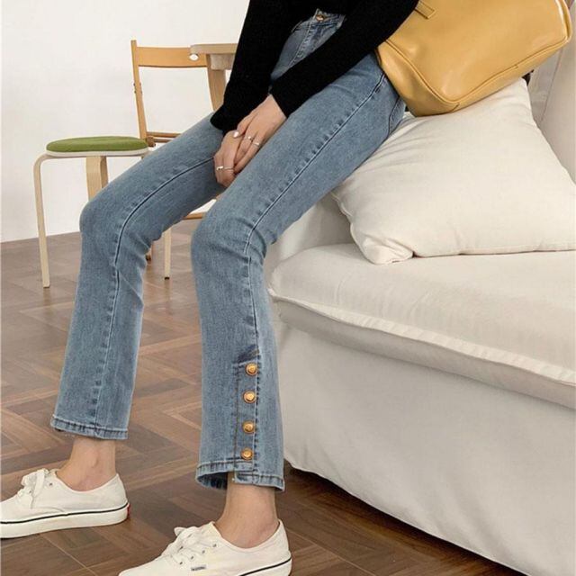 商品名:デニムパンツ レディース 美脚ストレッチ ハイウエストデニムパンツ フレアパンツ ボタン付き ジーパン(メール便送料無料)