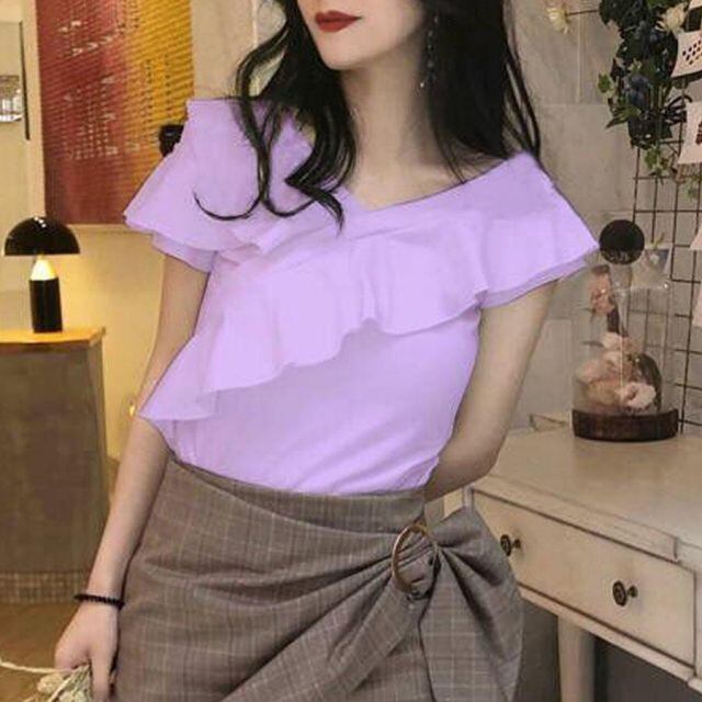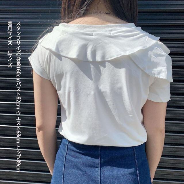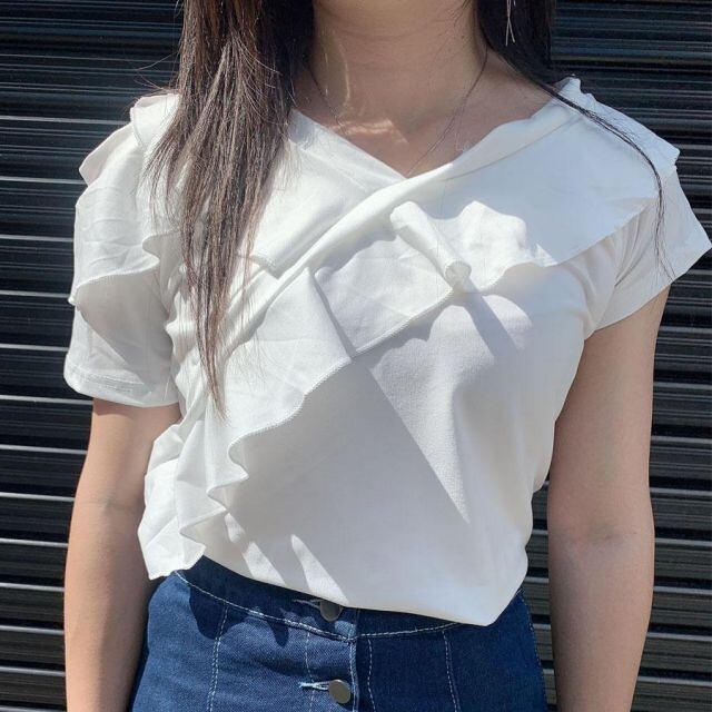 商品名:Tシャツ レディース カットソー 半袖 無地 フリル トップス プルオーバー お洒落 カジュアル 白 黒(メール便送料無料)