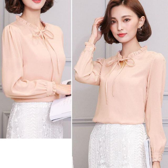 フリルとリボンのダブルの甘さ大人かわいいボウタイブラウス。