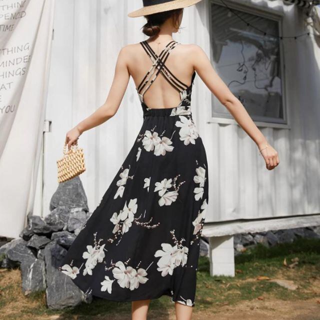 商品名:キャミワンピース 花柄 バックオープン Vネック 背中開き ノースリブワンピース シフォン バッククロス 背中魅せ 背中開き 夏ワンピース(メール便送料無料)