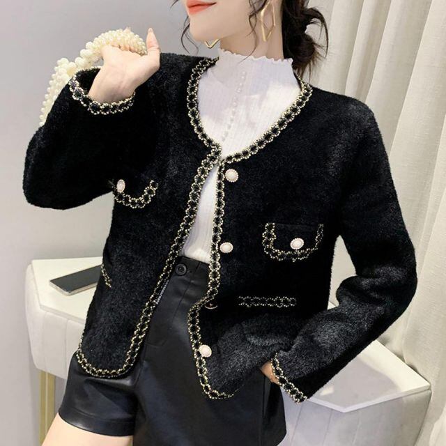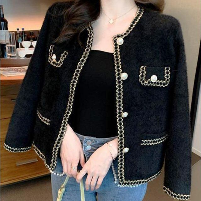 ツイードニット ジャケット ニットツイード ボタンジャケット 秋冬 長袖ノーカラージャケット フェイクミンクカーディガン 秋服(宅急便のみ対応)