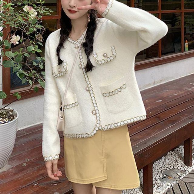 商品名:ツイードニット ジャケット ニットツイード ボタンジャケット 秋冬 長袖ノーカラージャケット フェイクミンクカーディガン 秋服(宅急便のみ対応)