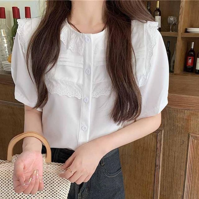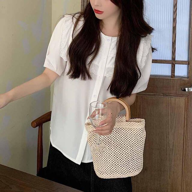 商品名:ブラウス ノーカラー レディース トップス 白シャツ 刺しゅう きれいめ 透かし雕り オシャレ 夏ブラウス 春夏 ビジネス 韓国風(メール便送料無料)