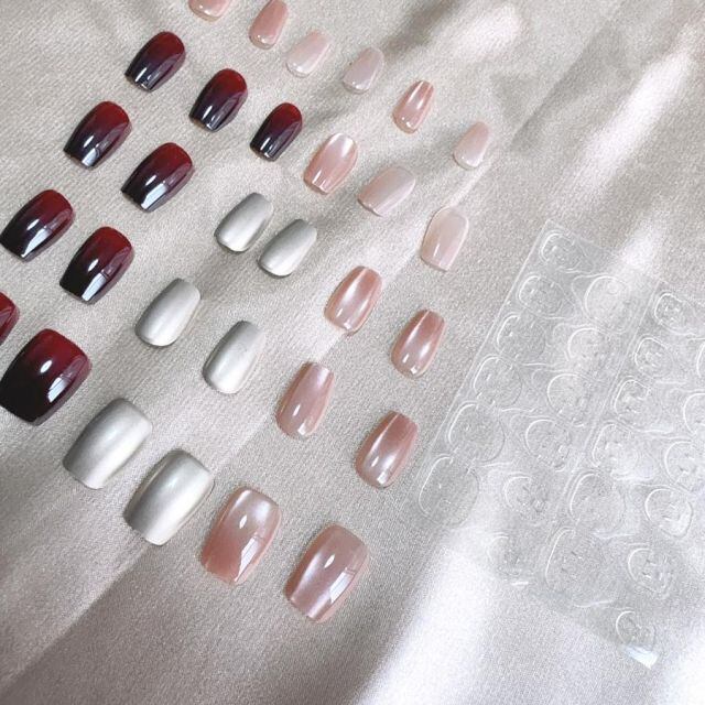 ネイルチップを爪の根本に合わせ、先端に向けて傾けるように貼れば完成です。
