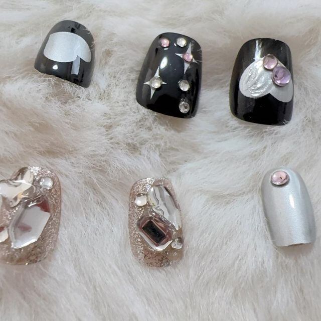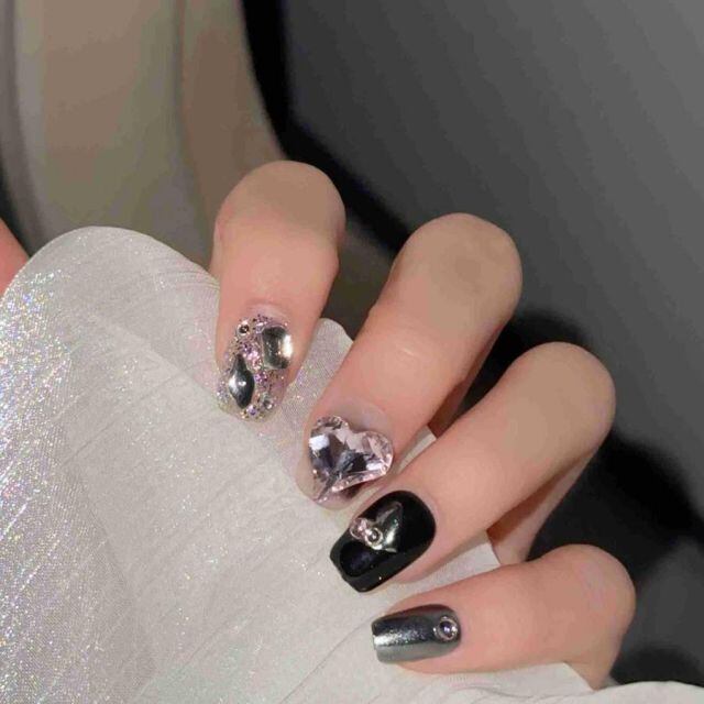 商品名:ネイルチップ ショート きらきら ブライダル ハート ピンク ブラック つけ爪 ネイルアート アートチップ デコチップ オーバル ウエディン(メール便送料無料)